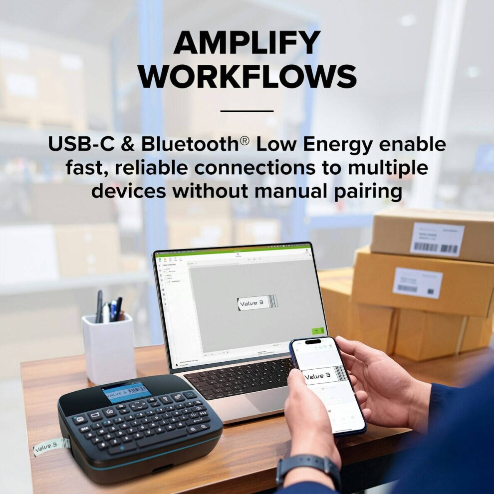 Ленточный принтер с полноцветным экраном! Ширина самоклеющихся лент 6,9,12,19,24 мм. Клавиатура — латиница. Печать при подключении к ПК через USB-C или смартфону через BLUETOOTH на РУССКОМ языке, импортирование графики, штрихкода.